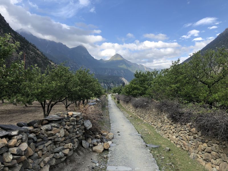 After the military camp, the forest opens up into the river bed. It’s hard to see signs from here, and there are several different paths across the open space. If you look closely enough, you’ll see the red and white markers. It feels a bit like playing a game of Where’s Waldo. When you reach the other side, stay to the left near the small village and apple trees. There’s a path that cuts through. After the adorable little town, there’s another opening where you have to keep an eye out for the path again. It eventually leads to a path with a 250m (820 foot) incline, but beautiful views of Dhaulagiri.